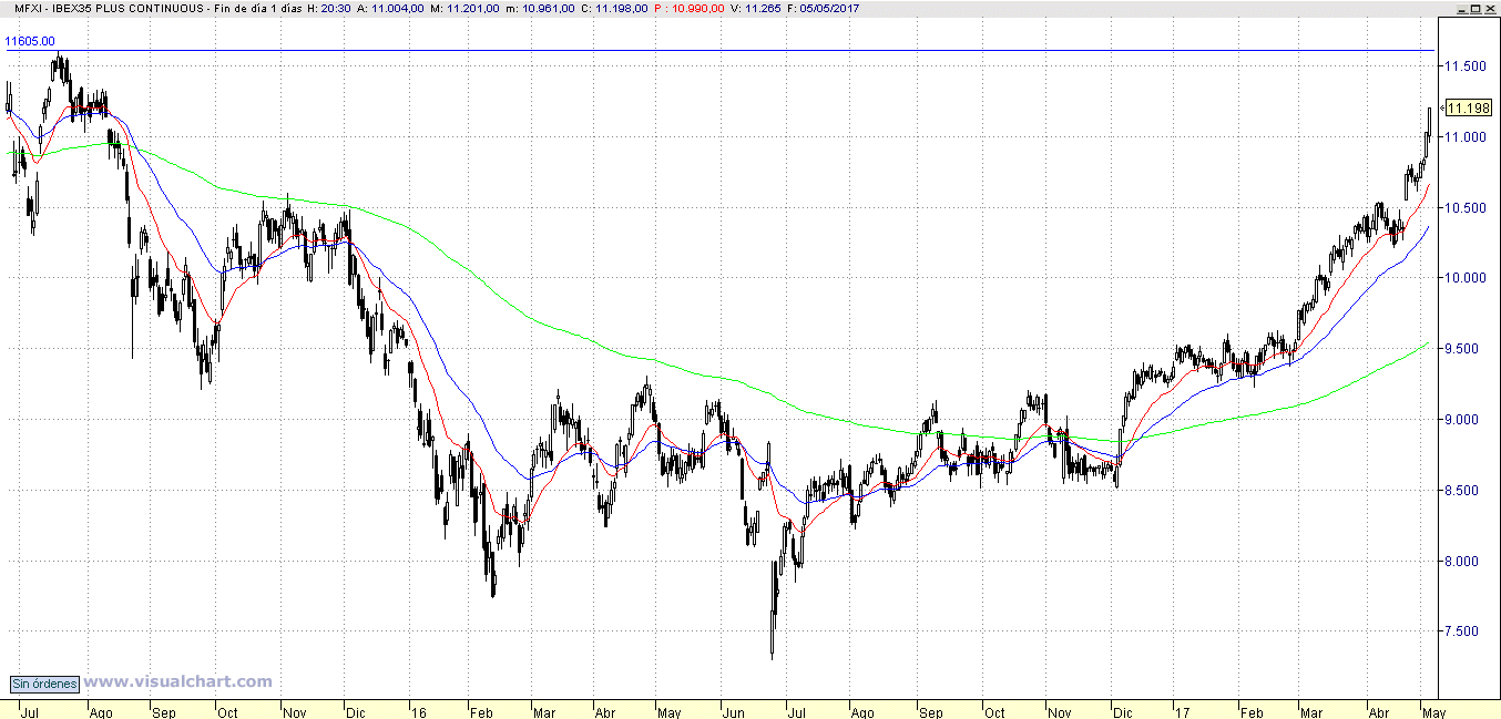 El Ibex está subiendo a una velocidad excesiva. No es que sea malo, pero la corrección que venga será más violenta. La clave está en cuando vendrá esa corrección, porque el pánico es muy violento en ambos sentidos, y podemos llegar hasta el 11.600 o incluso hasta el 12.000 antes de claudicar.