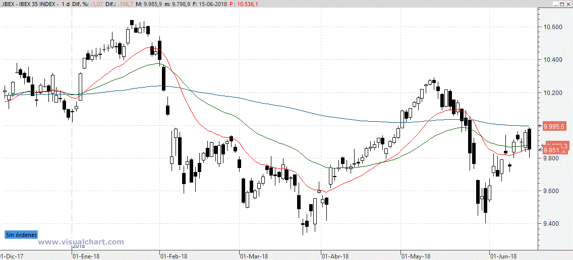El Ibex llevaba un camino muy bueno hasta el jueves, pero ayer viernes, abrió subiendo ligeramente hasta tocar su media de 200 días, un poco por debajo de los 10.000 puntos, y desde ahí se produjeron grandes ventas, produciendo la vela negra que vemos en el gráfico.