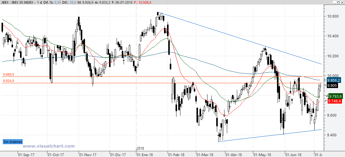 Con todo esto, habría que estar pendiente a la zona del 10.000 del Ibex, y podemos comprar si se superan, pero con un stop por debajo de los 9.900.