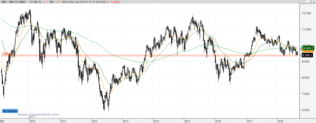 Poco ha durado la alegría, el Ibex subió a la zona de 9.600 y vuelve a caer a la zona de soportes que está entre el 9300 y el 9400.