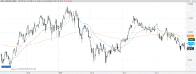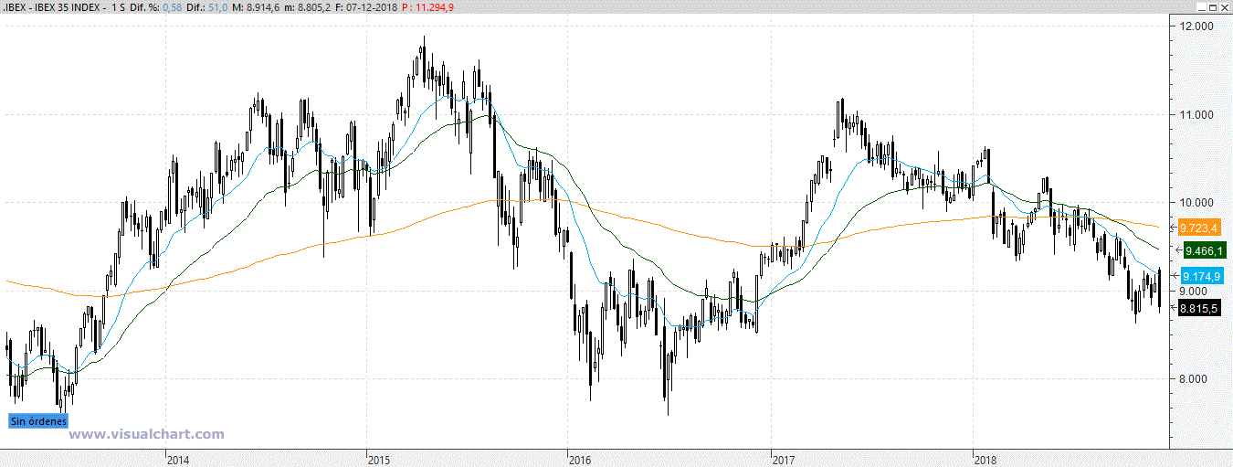 Nuestro Ibex no marca mínimos anuales, pero la debilidad es manifiesta.El gráfico semanal que mostramos es claramente bajista.
