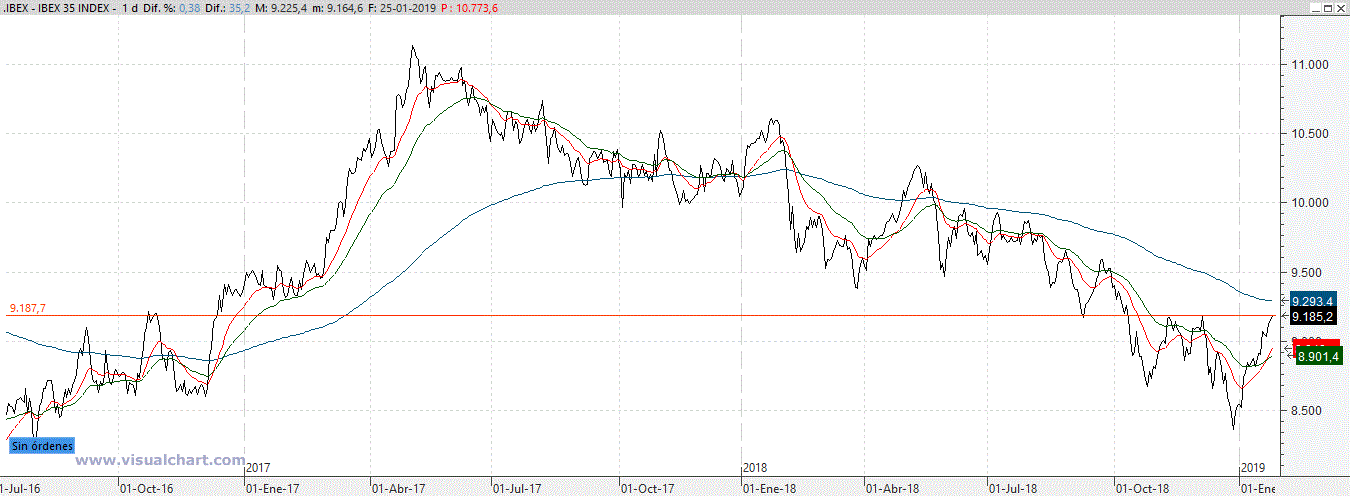 Esta semana he querido mostrar un gráfico de cierres, porque muchas veces éste gráfico muestra las resistencias y soportes mucho más claramente, y éste es el caso del Ibex.