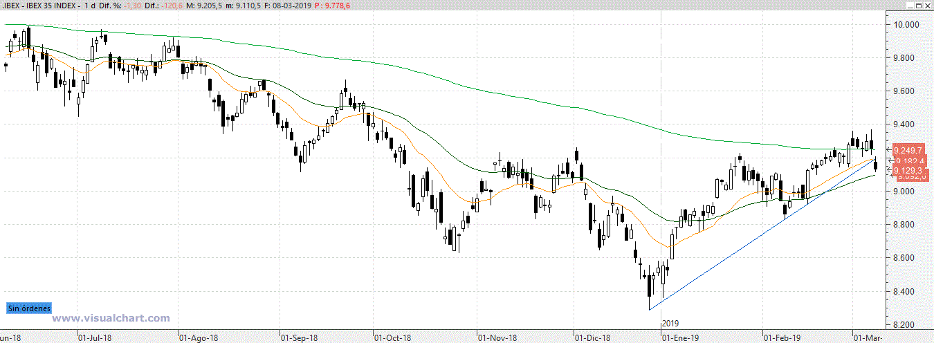 En dos días ha perdido el soporte de los 9140, cerrando en los 9129 puntos y perdiendo su tendencia alcista, como vemos en el gráfico.