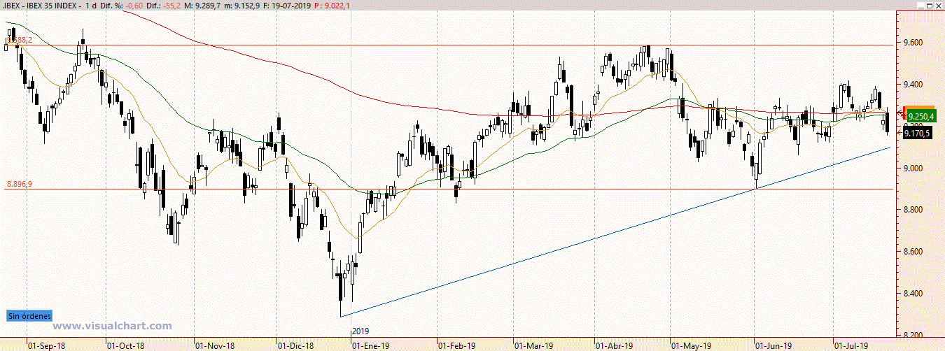 El Ibex sigue una semana más sin rumbo claro, bailando por encima y por debajo de su media de 200 dias, una media totalmente plana, que nos indica precisamente esa falta de tendencia.