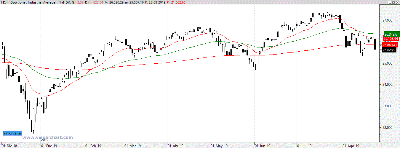 Si acabamos por perder los mínimos de la consolidación, supondrá una pérdida de un soporte importante por debajo de sus medias de 200 días, que es una de las señales más peligrosas que podemos ver en los mercados, porque muchas veces supone un cambio de tendencia de largo plazo. Si a esto le añadimos la peligrosa alerta que supone el triple techo, con divergencias semanales que advertimos hace tres semanas, el cóctel es muy peligroso, y los datos sobre la guerra comercial entre USA y China no parece que ayude mucho. Vemos el gráfico del Dow Jones.