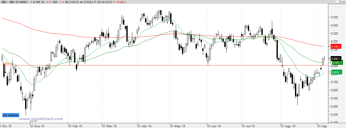 El Ibex, sin embargo, sigue teniendo aspecto bajista pese al buen rebote. Vemos en el gráfico cómo estamos por debajo de su media roja, la de 200 días, y de momento, debemos de considerar esta subida cómo un rebote dentro de una bolsa bajista. Es cierto que hemos recuperado el soporte perdido en la zona de los 8900 puntos y eso es bueno, pero por otro lado, es un nivel a vigilar, porque si lo volvemos a perder, se pondría todo feo de nuevo en nuestra bolsa.