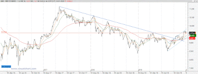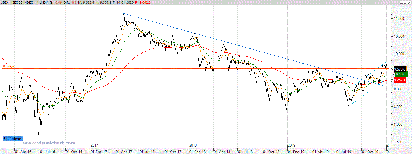 Esta semana mostramos un gráfico de cierres, y observamos que cierres por encima de los 9570 siguen siendo muy positivos para el Ibex, aunque hay que tener en cuenta que precios por debajo de los 9.500, harían saltar algunas alarmas, aunque realmente la estructura de máximos y mínimos crecientes, solo se rompería por debajo de los 9.135 de cierre.
