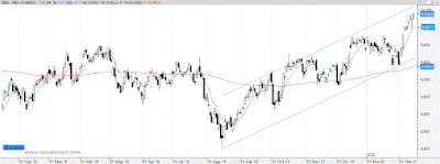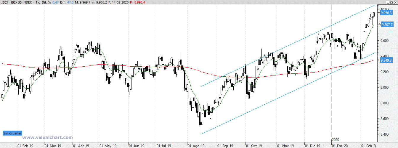 El Ibex, sigue muy fuerte, y parece que la subida en el corto plazo va a seguir. Habría que utilizar ahora la técnica de la media de 10, que nos dice que mientras el precio esté por encima de ella y ésta siga con pendiente positiva, habría que seguir confiando en el muy corto plazo, sin realizar beneficios.